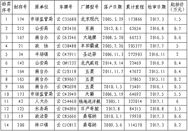 經鎮(zhèn)雄縣人民政府批準,公開拍賣鎮(zhèn)雄縣公務用車改革取消車輛(第三期)14輛。相關事項如下: